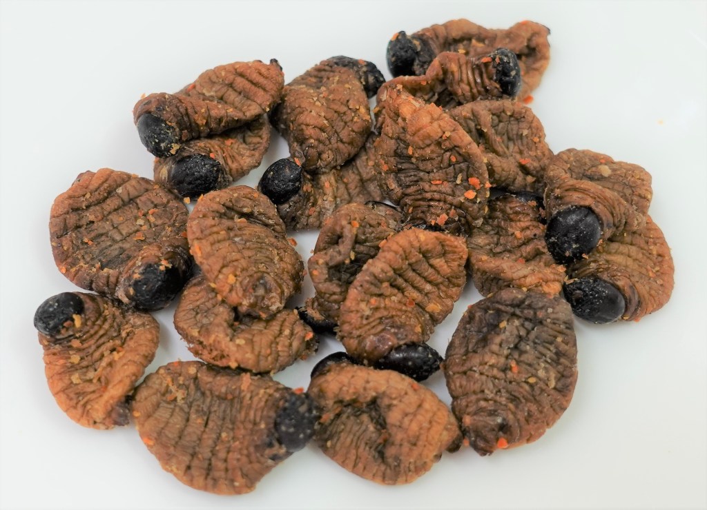 特注なのでパッケージに「レッドペッパー・サゴワーム」のラベルがない(^ム^) ご丁寧にレシピまでご教示下さった。「生のサゴワーム解凍 → 茹でる → 蒸す → 辛み成分と塩分を沁み込ませる → 乾燥」 はまる食品さん、本当にありがとうございました。感謝、感謝です。