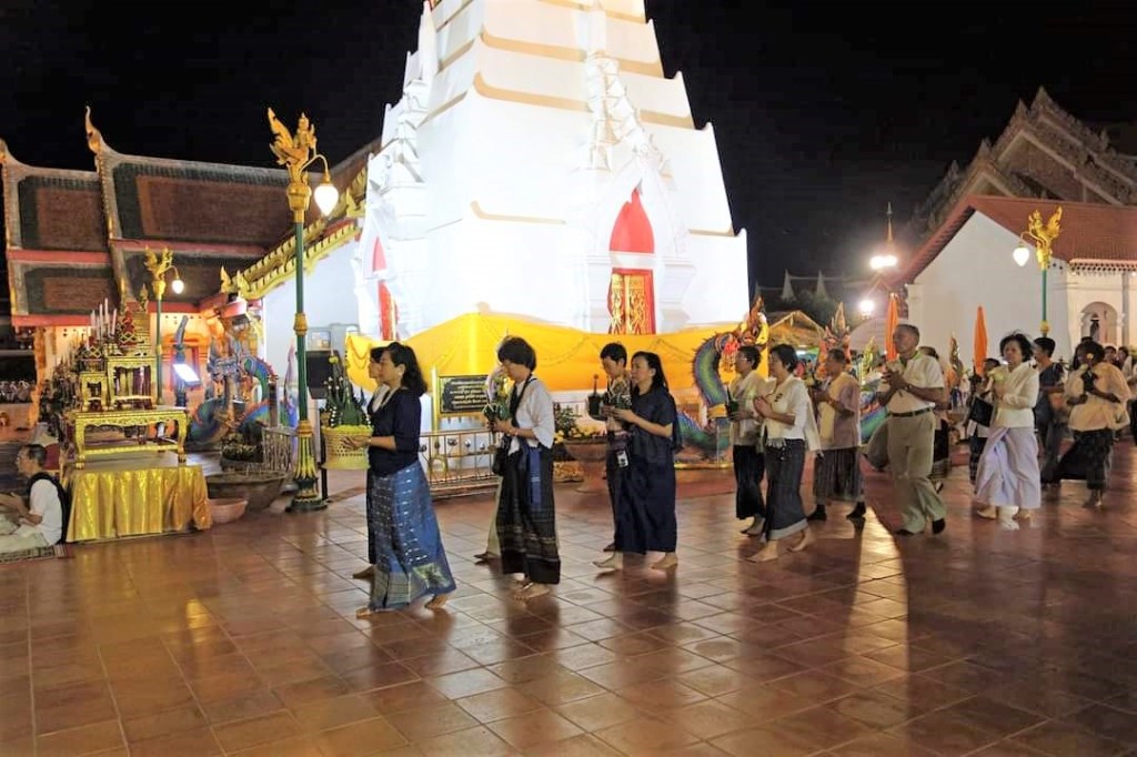 タイ東北部サコンナコンにある王宮守護寺院「ワット・プラタート・チュンチュム」は、仏事が行われるたびに、夕方から夜にかけて地域の人々が集まり、盛大に祈りを捧げる。月明かりとライトに照らされた本堂および仏塔は、とても綺麗である。