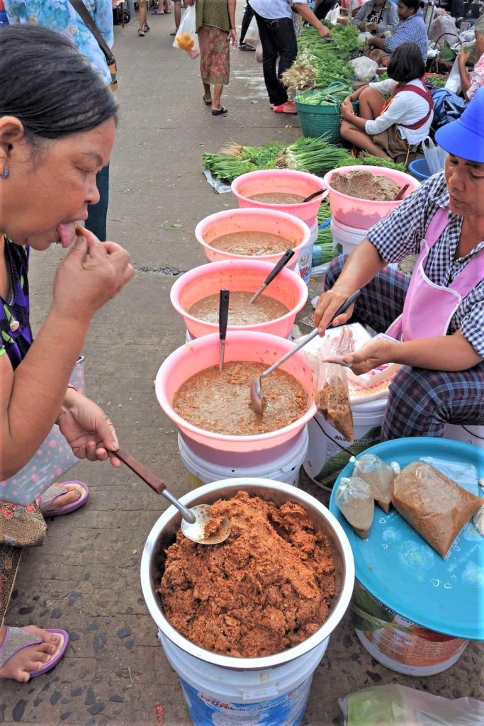 タイの味噌って種類が多そう。タイ人は市場で味噌を買うときは、味を確かめて買うようです。