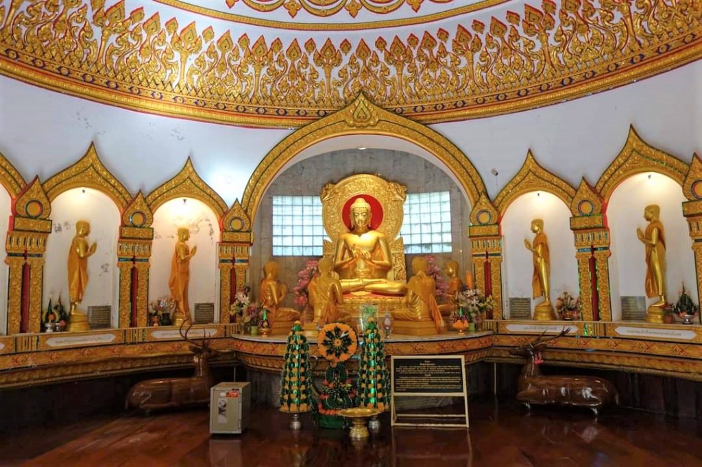 本尊の両脇にシカがいたのが気になった。さらに仏塔の外にもシカのオブジェがあったので、シカにまつわる由緒があるものと思われる。シカ寺院