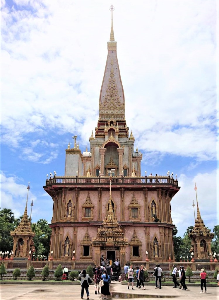プーケット島の南部にそびえ立つワット・チャロン寺院の仏塔は、高さ60mのランサーン(ラオス)様式の仏塔で、3階のデッキからの眺めがとても素晴らしい。途中1階、2階の壁には、仏陀の生涯が色鮮やかに描かれている。