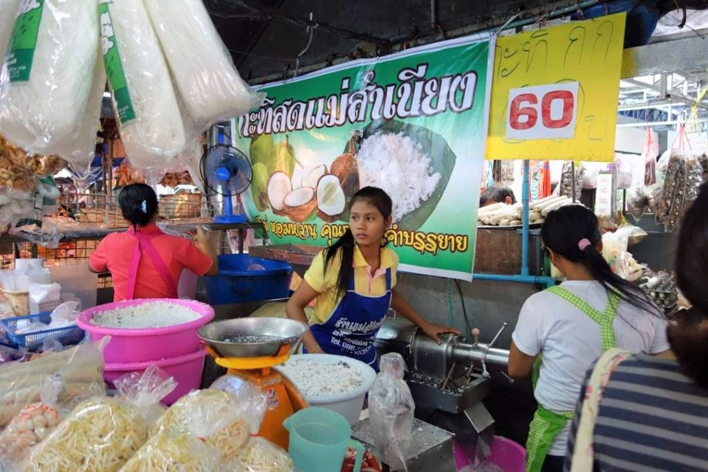 タイ東北部スリンの市場で見かけたココナッツミルクの精製風景です。