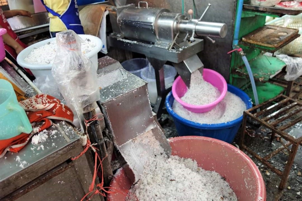 機械の下のバケツで搾られたココナッツミルクを受ける。そして絞りカスが出てくる。1kg 60バーツ(210円)