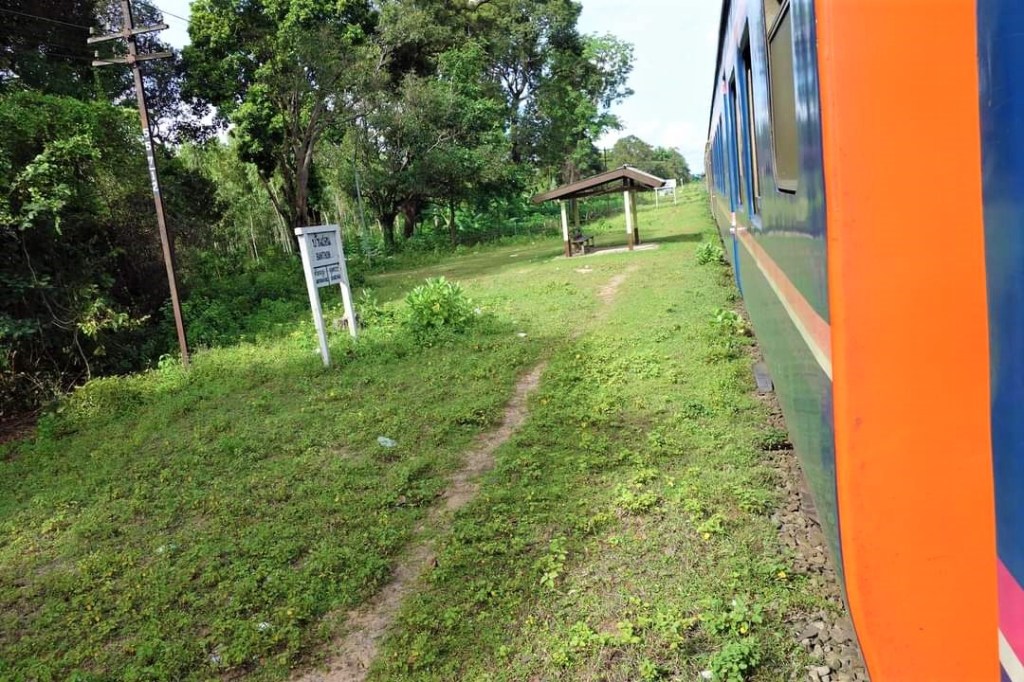 タイ東北部ウボンラチャタニからスリンへ向かっている時の途中駅。プラットホームどころか駅舎もない。駅から離れた原野の中に、家や村が点在するのだろうか…