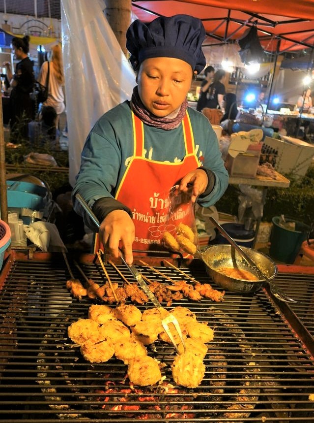 カオジー屋さん ムーピン(豚の串焼き)も一緒に焼いて売っている。カオジーもムーピンもひとつ5バーツ(17円)ウボンラチャタニの夜市