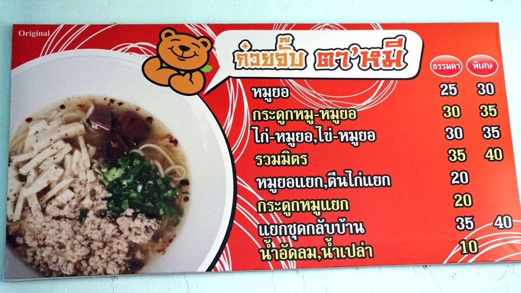 この店のメニュー。ムーヨー(豚肉ソーセージ)のせだけだと25バーツ(80円)、ムーヨーと鶏挽肉のせは30バーツで、大盛はそれぞれ5バーツ増し