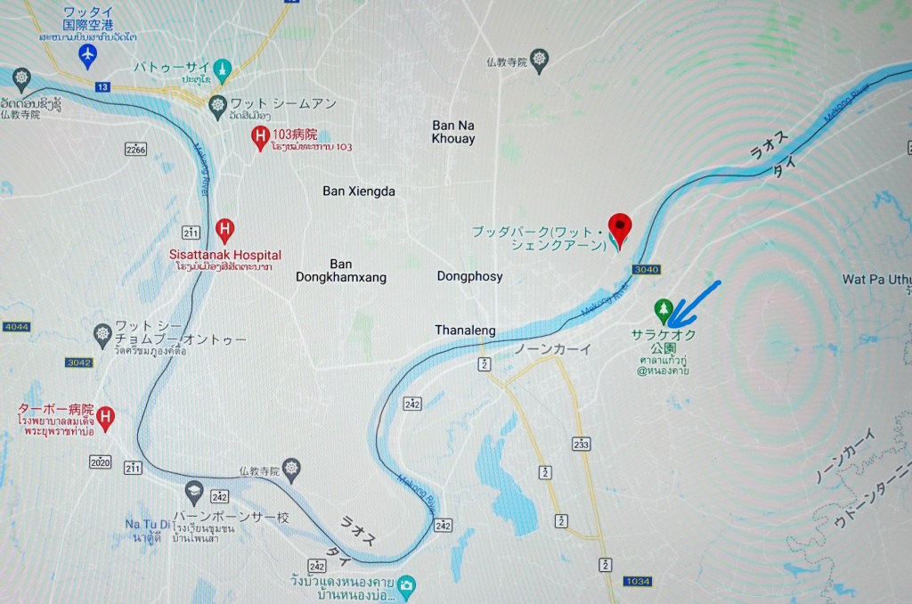 ラオス側のブッダパーク「ワット・シェンクワン」と、タイ側のノーンカーイにあるブッダパーク「ワット・ケーク」通称「サラケオク」は、直線距離で2~3kmしか離れていない