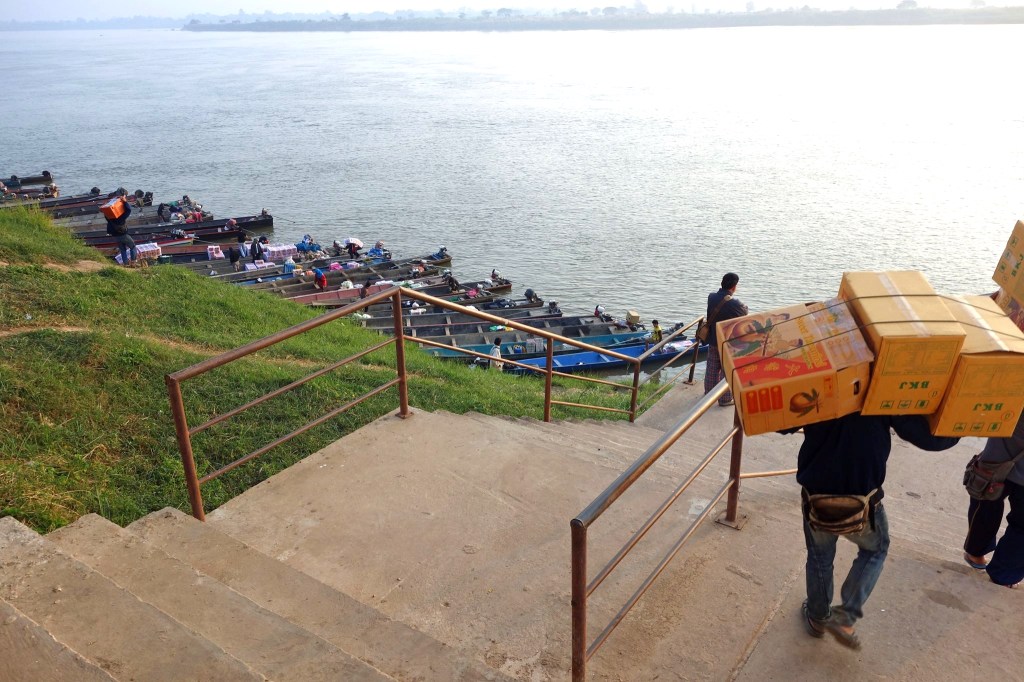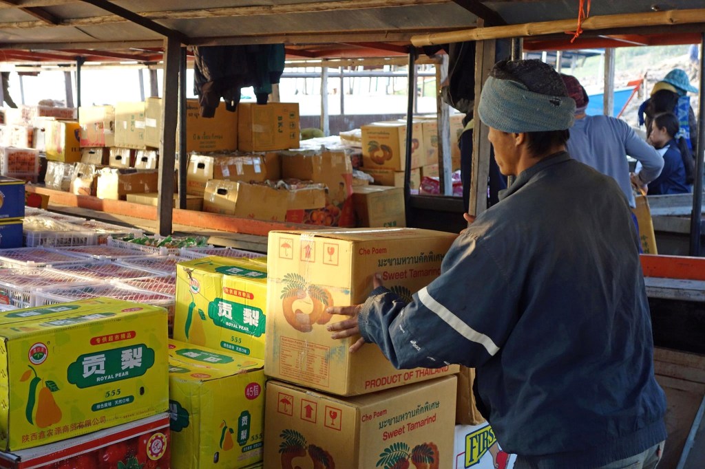 ラオスからの物資を下ろしたら、今度はタイの物資を舟に積み込む。