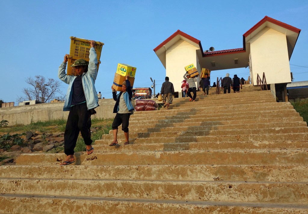 タイ東北部タートパノムの早朝、ラオスの舟が物資を積んで国境のメコン川を渡り、次々とタイ側に到着する。