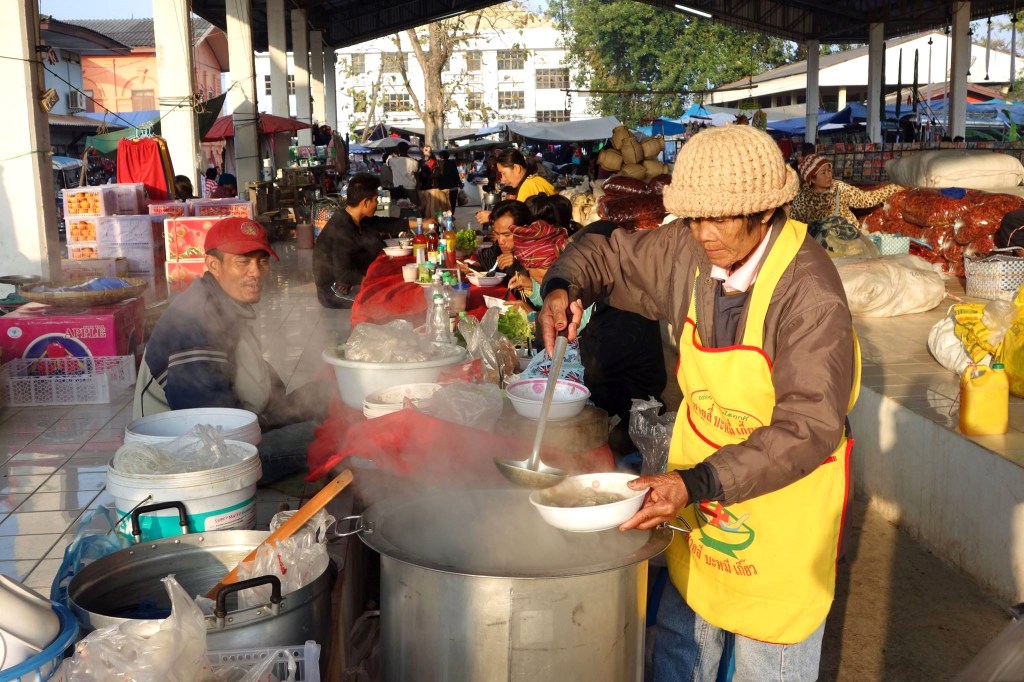 舟着き場の上には活気にみなぎる朝飯屋があった。ここで食事をしてラオスに戻る
