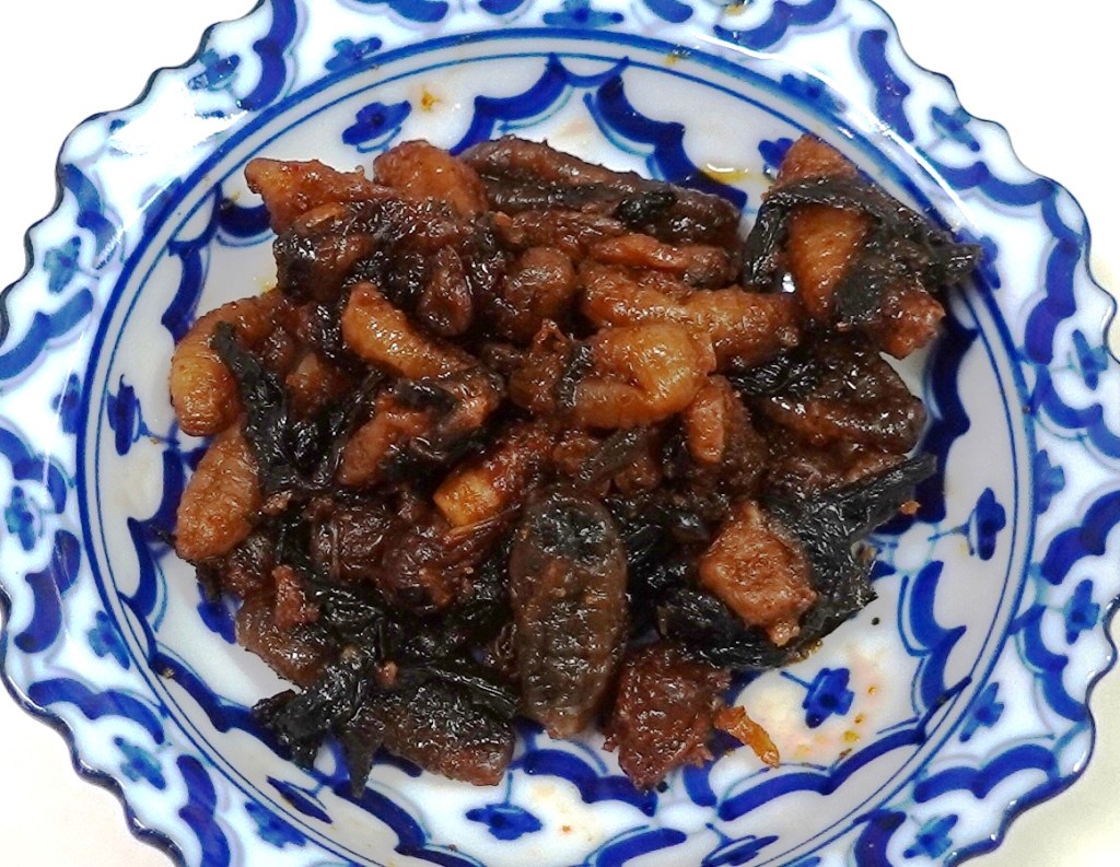 【カイコ】Bombyx mori (Linnaeus,1758) 佃煮のしっとり感が少なく、意外にカイコ内部はサクサク感がある。甘みもあり食べやすい。ピスタチオ・カルダモンのかけらが味を添えている。