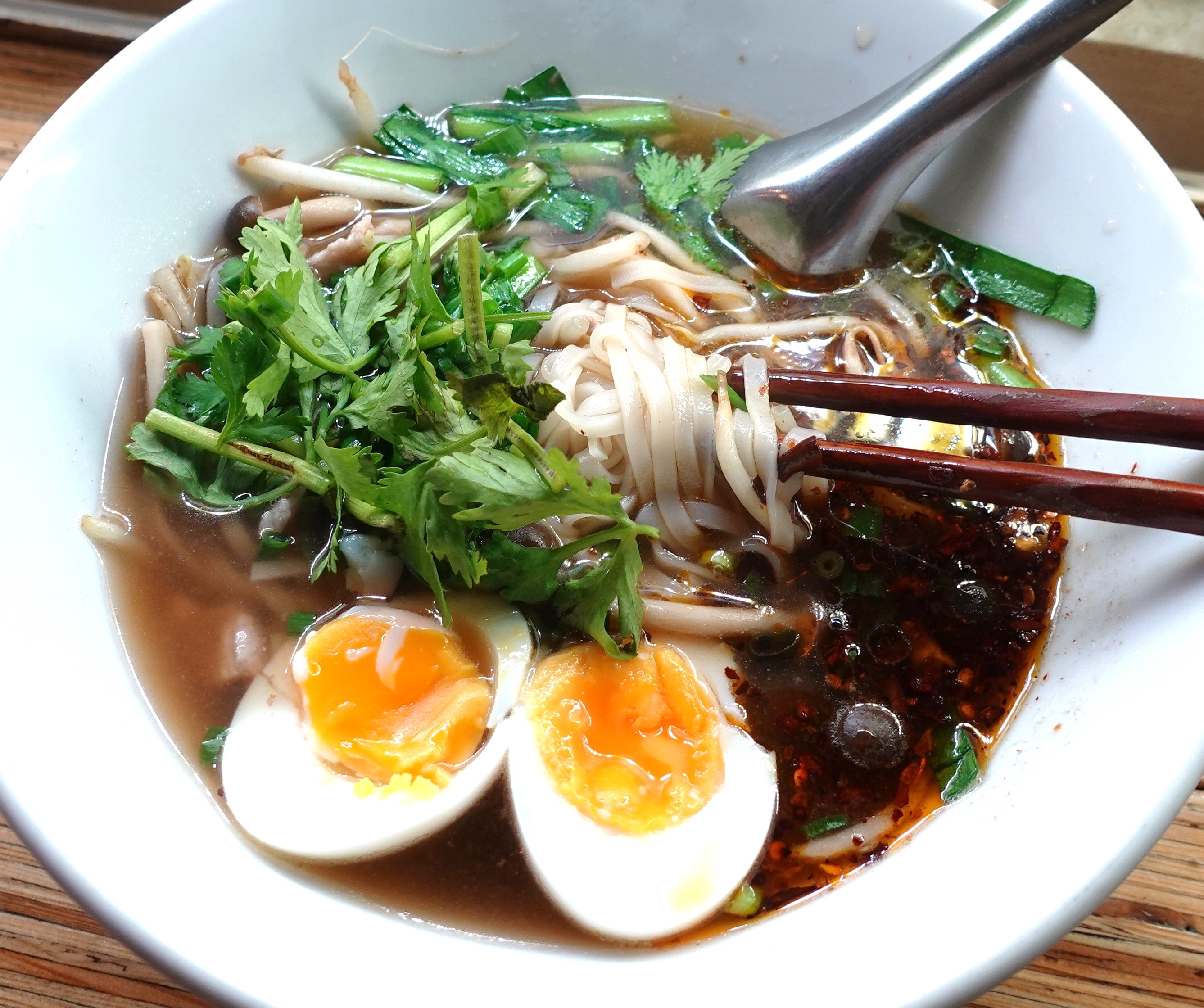 立川のタイ料理店カオマンガイ バザールで、イサーンラーメン「クイジャップユアン」と、揚げご飯のサクサク感がたまらない「ネームクルック」を食べた。 ▇ クイジャップユアン ก๋วยจั๊บญวน クイジャップとはタイ語で米 … 続きを読む 「クイジャップユアン」と「ネームクルック」を立川のカオマンガイバザールで食す