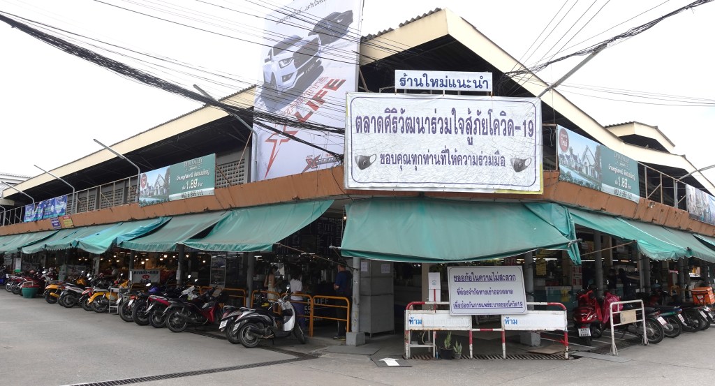 市場正面に、COVID-19に対する呼びかけの看板が掲げられている