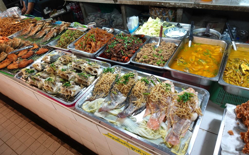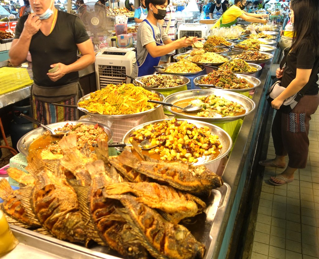 種類豊富なお惣菜が並び、ゲーン汁物もある。ご高齢の日本人男性を見かけた。この近くに住んでいれば年金で十分生活できる