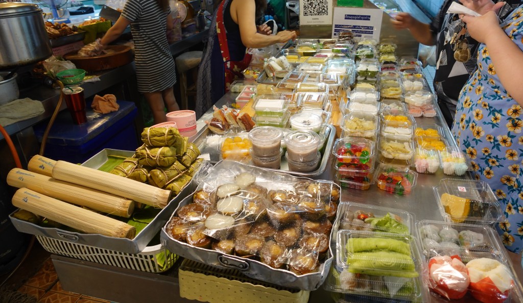 お惣菜や生鮮食品やフルーツ、お菓子など何でもある。一休みするコーヒー屋もあり、奥の建物へ進むと洋服やバックや靴、それにカオマンガイ、パッタイ、カオソーイなどが手軽に食べられる大食堂まである。