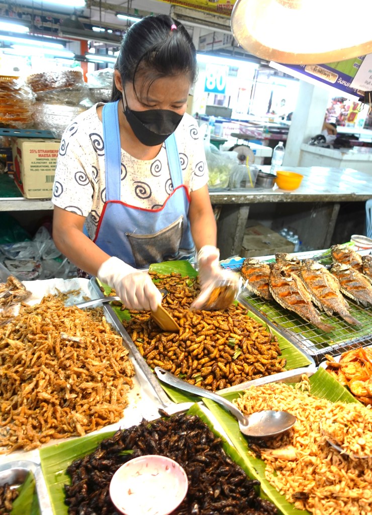チェンマイの台所「ターニン市場」に揚げ魚などと一緒に揚げた昆虫を売っている。昆虫の種類的には、カイコ、黒コオロギ、白コオロギの3種類で、外国人観光客が行き交う日曜夜市ほど種類数は多くはない。