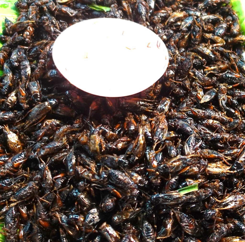 揚げた黒コオロギ、一皿20バーツ(75円)