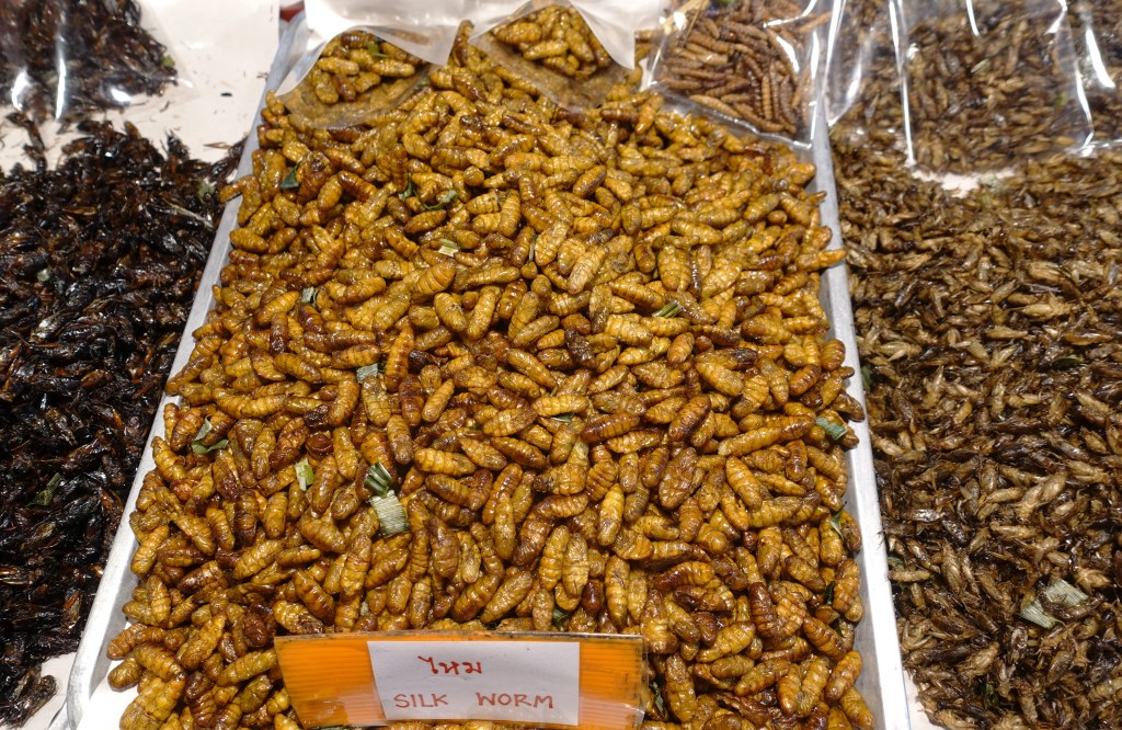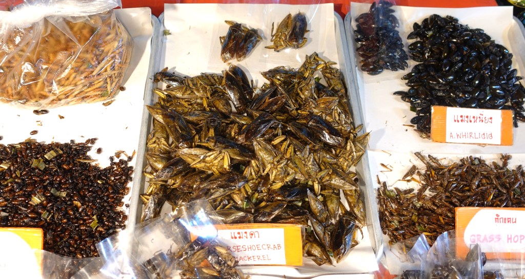 「Fried insects」中国語で「炸昆虫」と書いてあり、その横には昆虫の種類が写真と共に中国語で表記されている