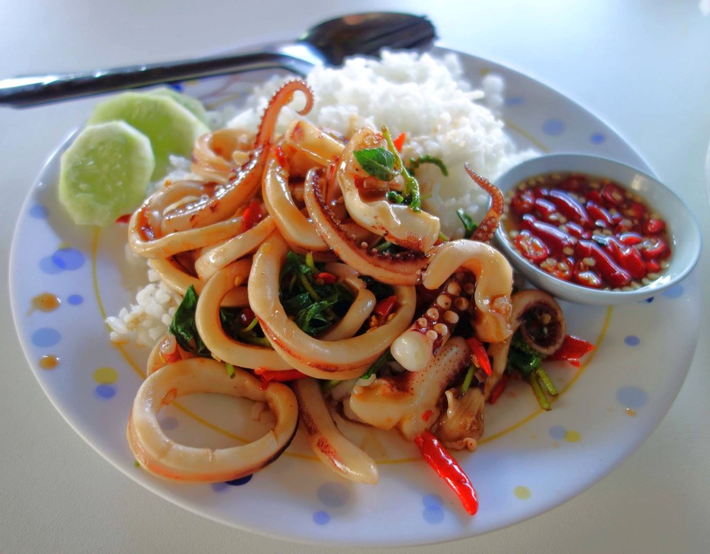チェンマイの食堂 Khao Tom Baht Diao で食べた「イカのニンニク炒め」55バーツ
