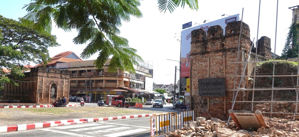 旧市街の北側中央に築かれた城門。現在修復工事中。むかし白い象が新しい都チェンマイを造るのにどこがいいかと探している途中この近くで息絶えたので、白い象の門、タイ語でチャンプアック門と名付けられたという
