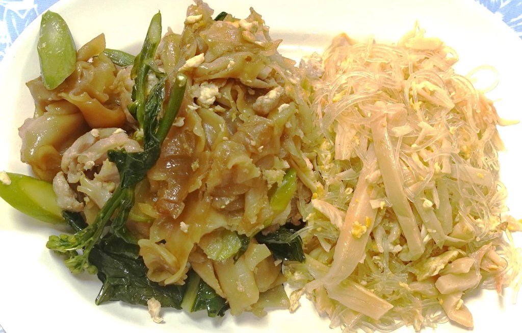 また麺類だけを注文することもできる。その時はどれを何バーツ分欲しいかを伝える。「太麺焼きそばを20バーツ、竹の子ビーフン炒めを20バーツ」と注文するとこのようになる