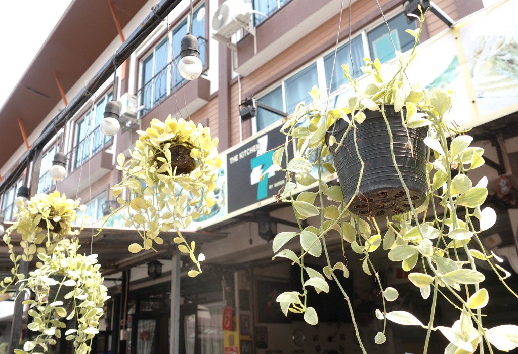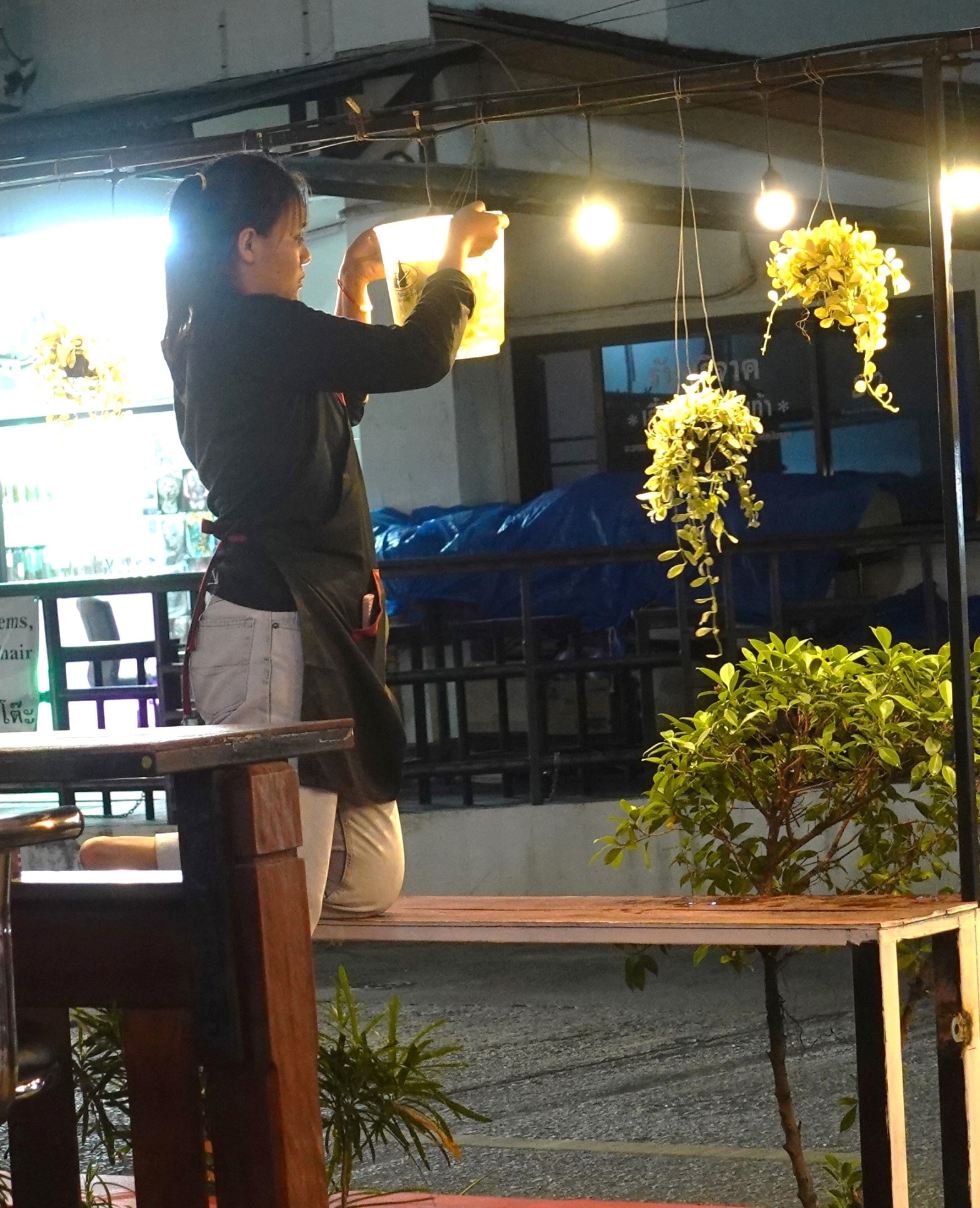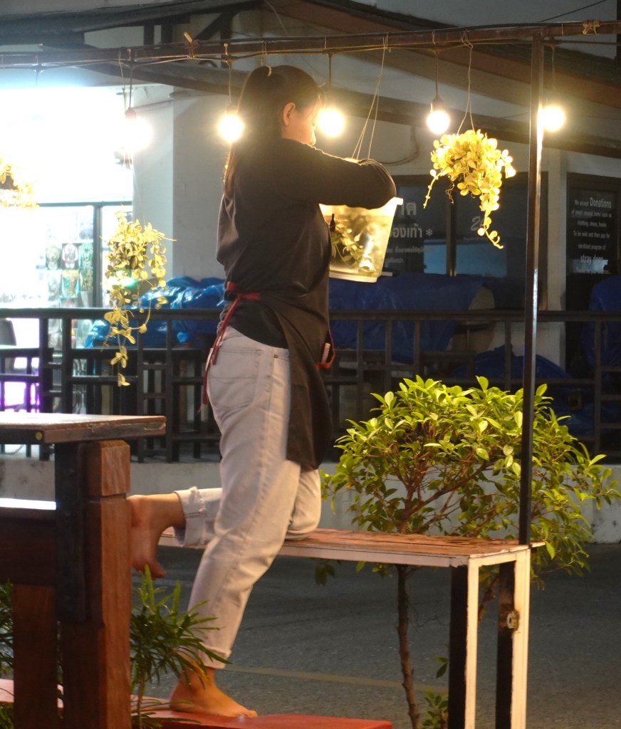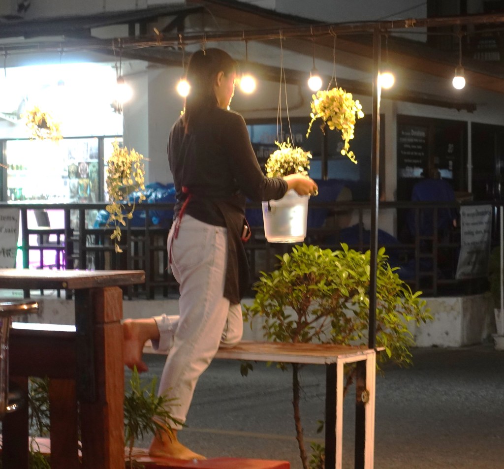 昨晩オープンカフェで水割りを飲みながら寛いでいたら、女性従業員が軒下につるした植木鉢に思いがけない方法で水をやっていた。