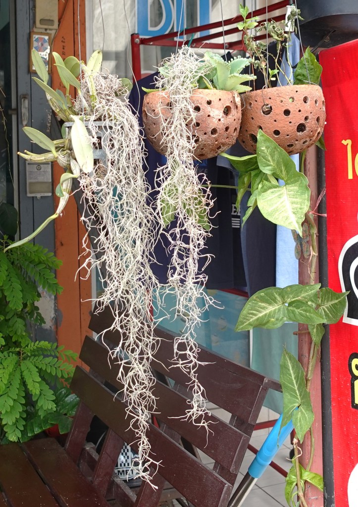 つるすタイプの植木鉢にもいろいろあり、木を井形に組んだものや、素焼きの鉢に大きな穴があいたものなどがある。雨季の土砂降りの雨にあっても水はけがよく、空気が通るようにして根腐れが起こらないようになっている