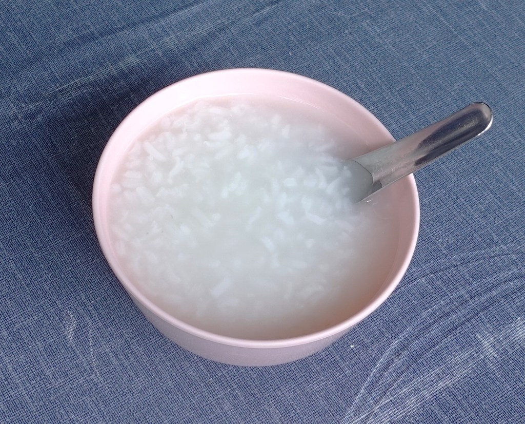 これが1バーツのお粥「カオトム」 味付けナシのお粥そのもの テーブルの上の調味料で自分好みの味にする