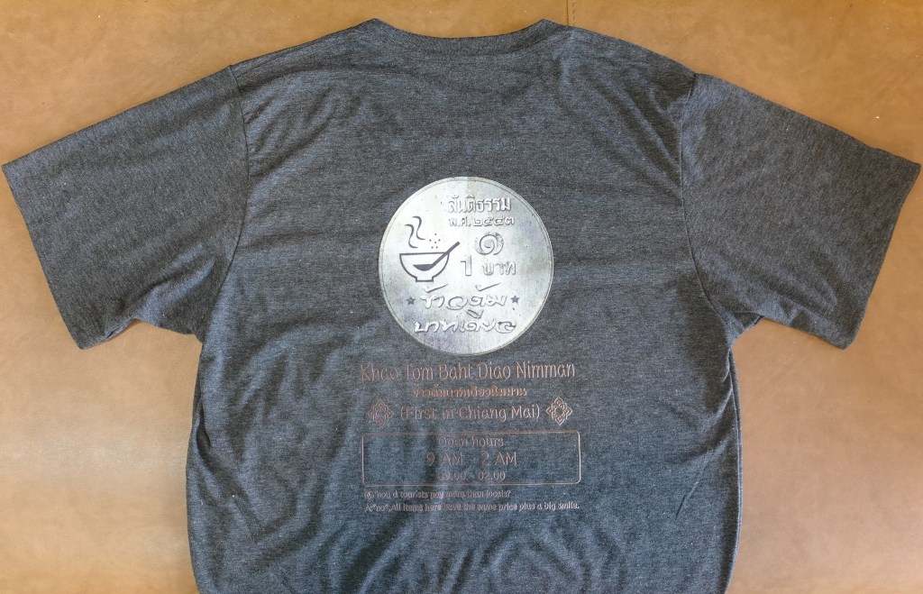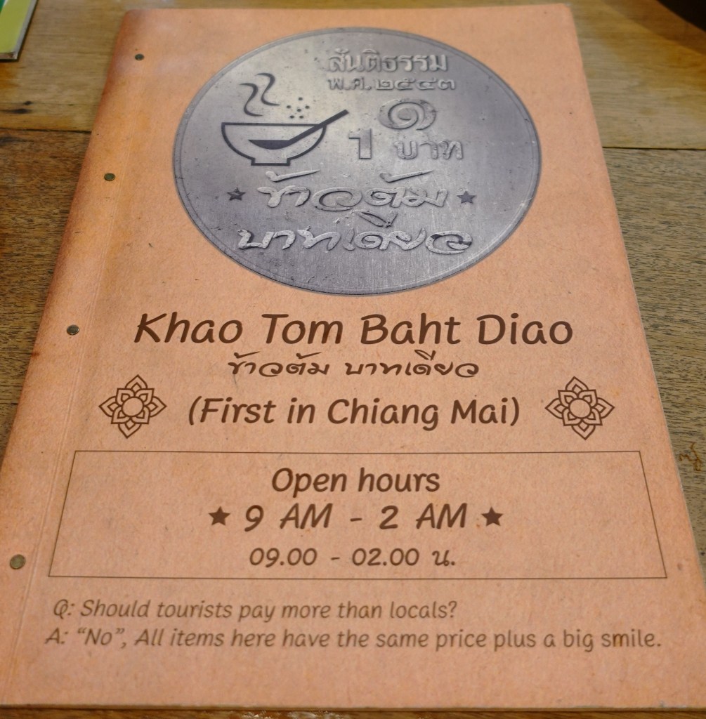 チェンマイに住み始めてからずっと気になっていることがあった。それは、ときどき夕飯でお世話になっているタイ料理店 Khao Tom Baht Diao であるが、屋号にもなっているようにお粥「カオトム」1杯が1バーツと看板に掲げてあるし、従業員のTシャツにもその商標がデザインされている。本当に1バーツなのだろうか…