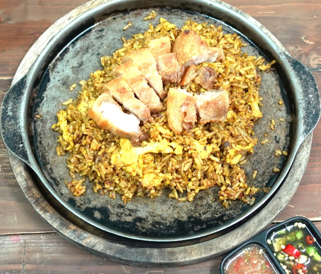「カオパット・ゲーンハンレー」Northern style hang lay curry fried rice (80B) 確かにゲーンハンレーの味。 付いてきたタレをカリカリ豚にかけて食べるともう最高。敷物と一緒に移動させるとき指を火傷した😁