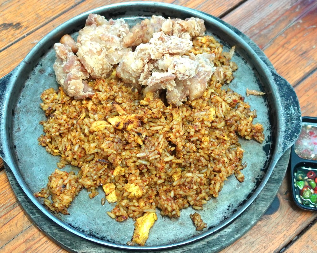 「カオパット・カオソイ」Northern style curry (Khao Soi) fried rice(60B) 薄味の鶏唐揚げにタレをかけると全体が美味しくなる