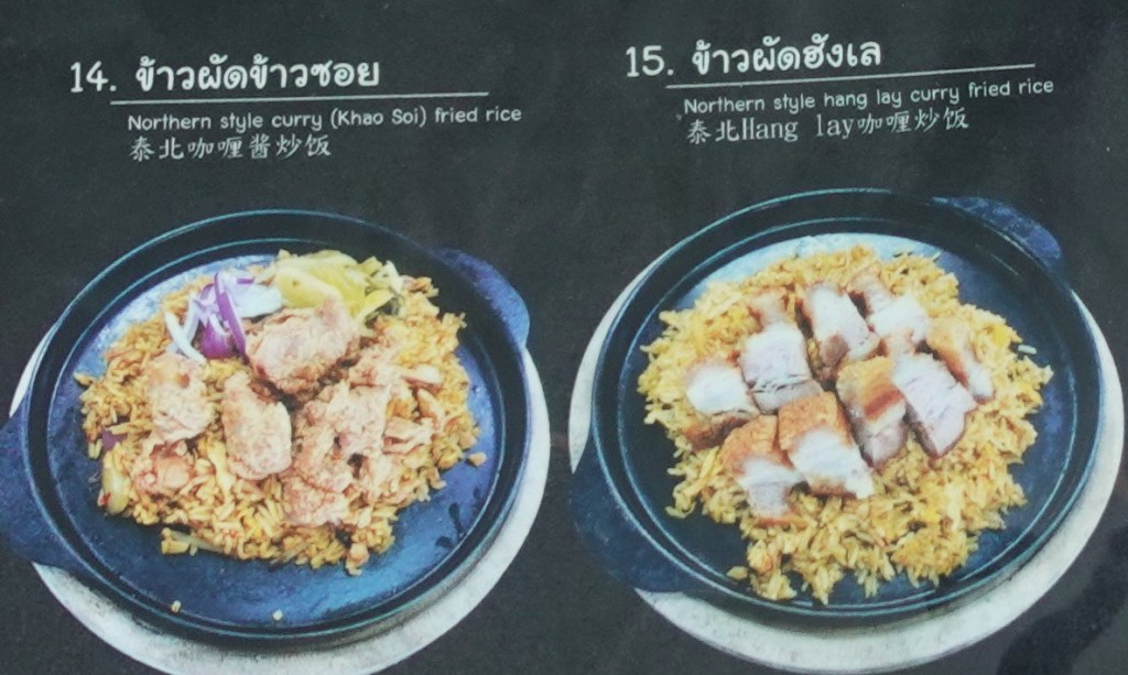 そこにはいろんな種類のカオパットがあり、中でもタイ北部らしい「カオソイ炒飯」と「ゲーンハンレー炒飯」が際立つ。前回行ったときはタイ語の先生オススメの「ゲーンハンレー炒飯」を食べ、きょうは「カオソイ炒飯」を食べた。