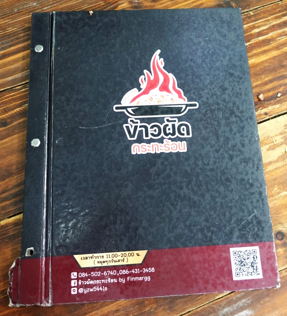 「メニュー」の表紙には店の商標 ข้าวผัดกระทะร้อน 鉄板は本当に熱々
