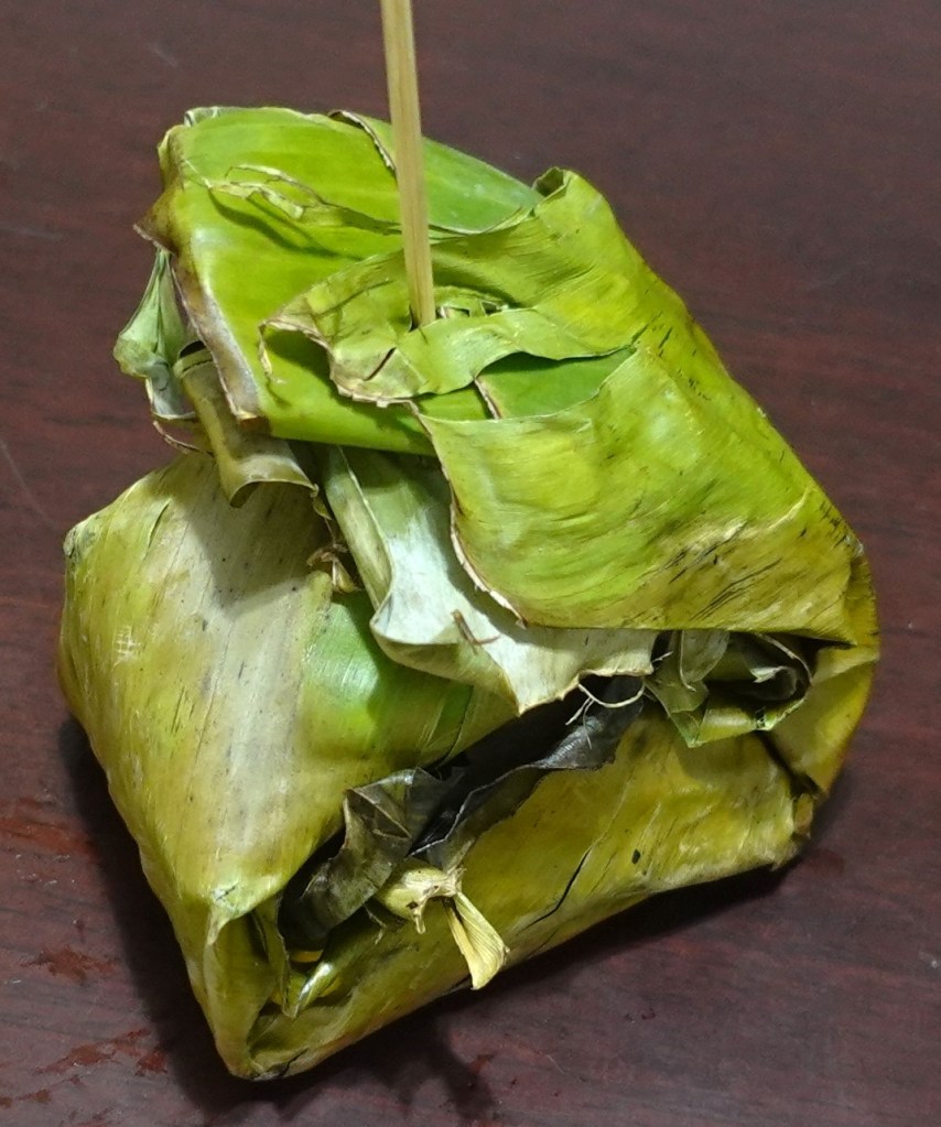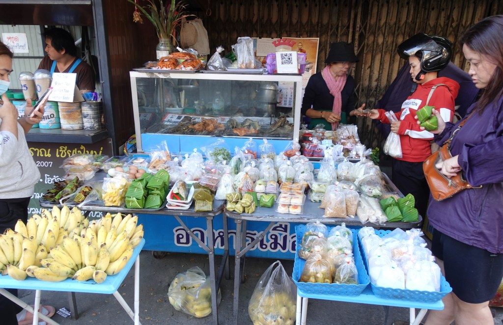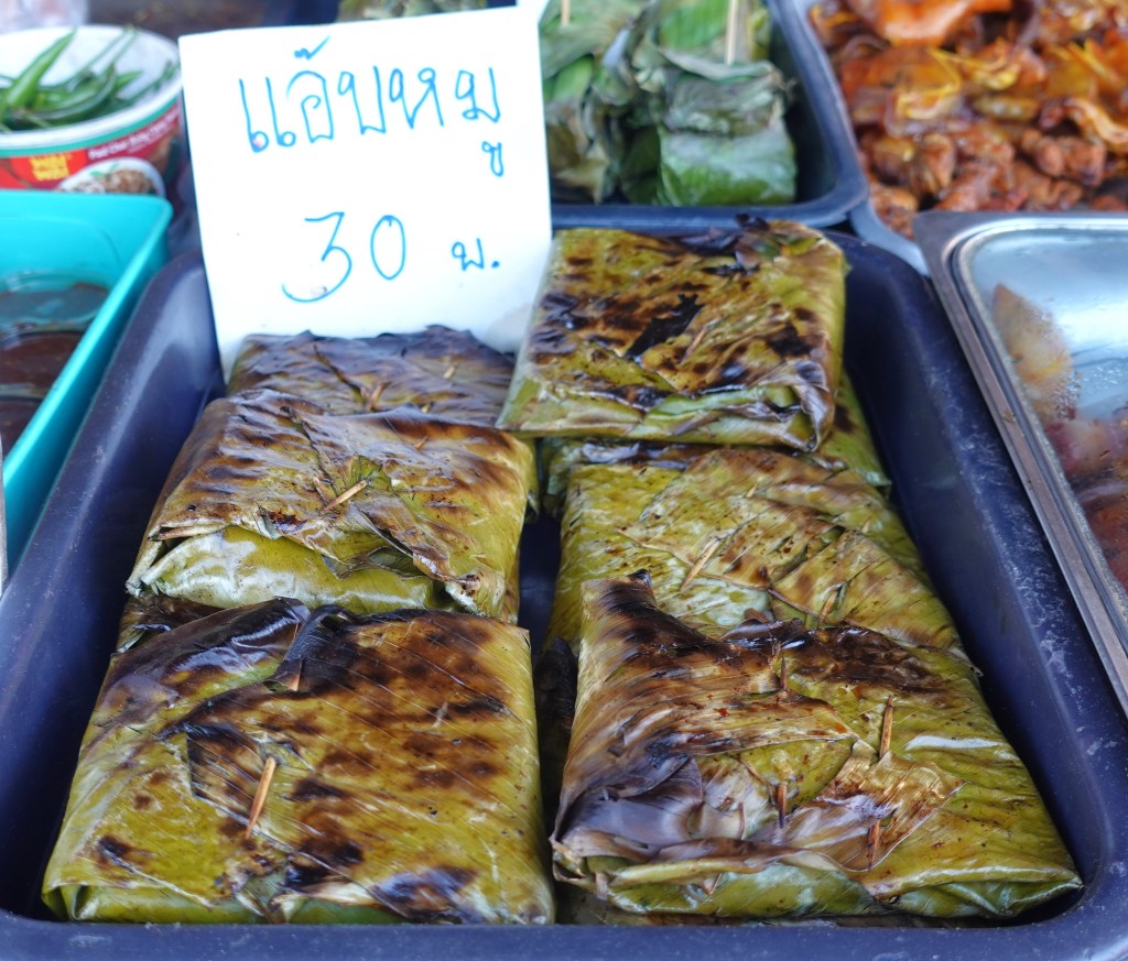 チェンマイのターニン市場へ午前中に行くと、バナナ葉に包まれた料理が販売されている。常連になれば分かるのであろうが中に何が入っているのか分からない