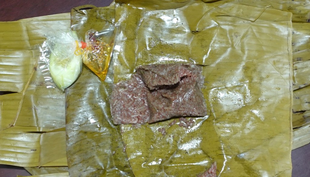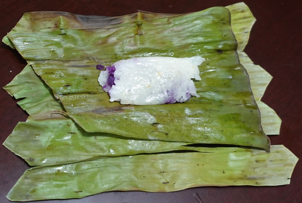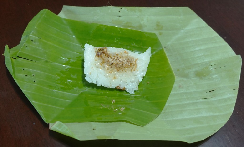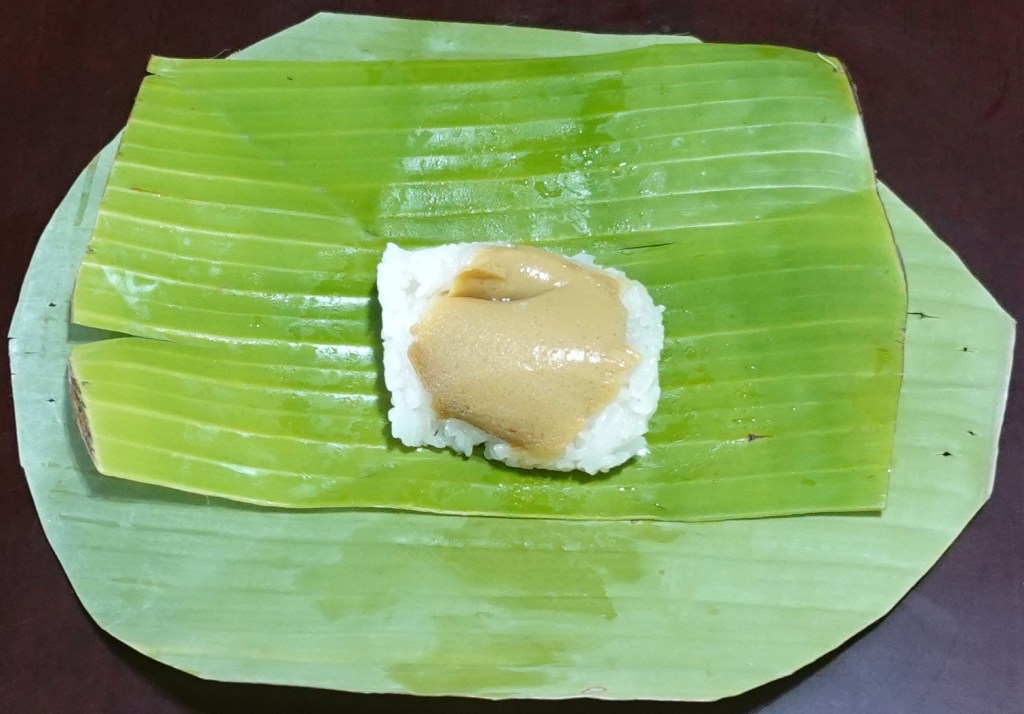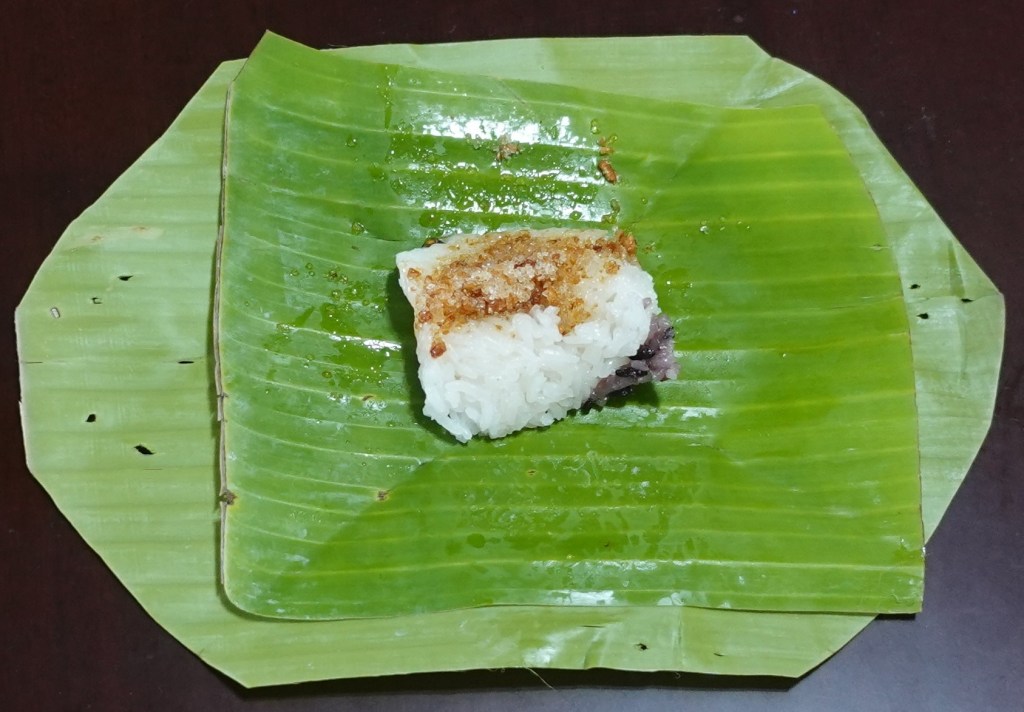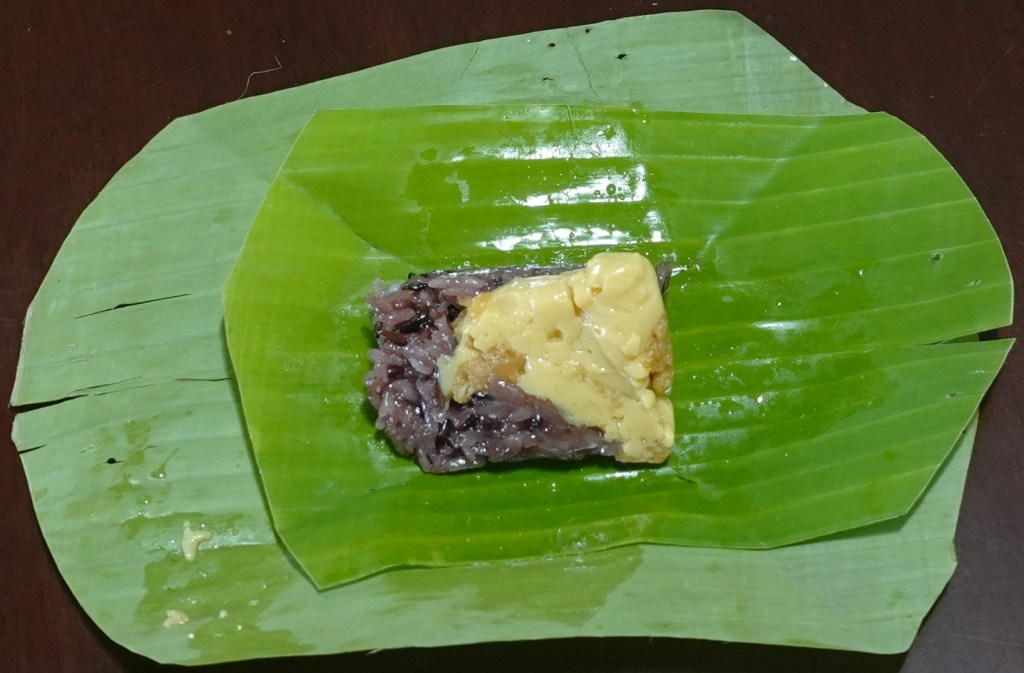 「カウガンジン」ข้าวกันจิน 豚の血入りご飯 上の画像のバナナの葉を開いたところ