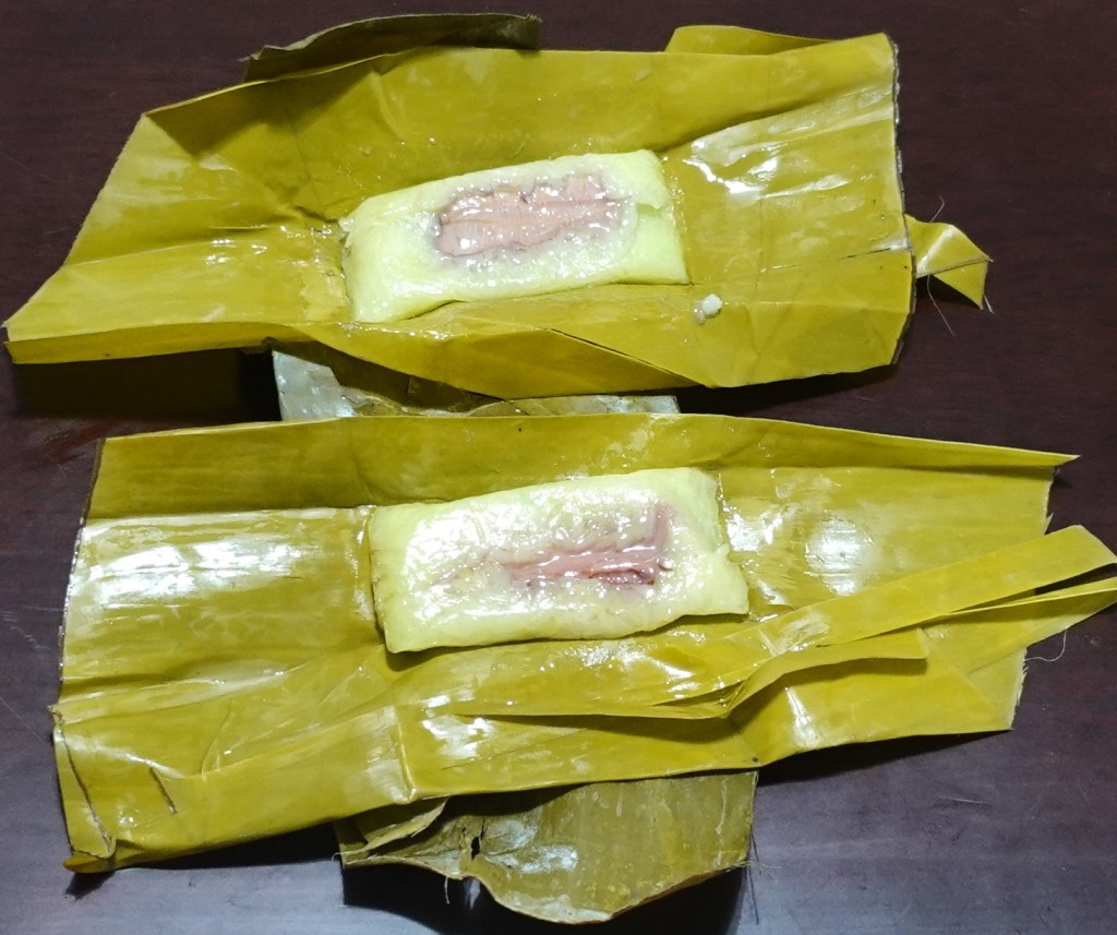 「ネームモックカイ」แหนมหมกไข่ 上の画像のバナナの葉を開いたところ