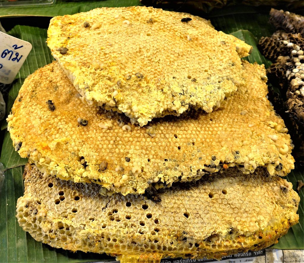 タイ北部ランパーンの市場 ミツバチの巣をバナナの葉に包みかるく焼いたものを生のミツバチの巣と共に販売していた