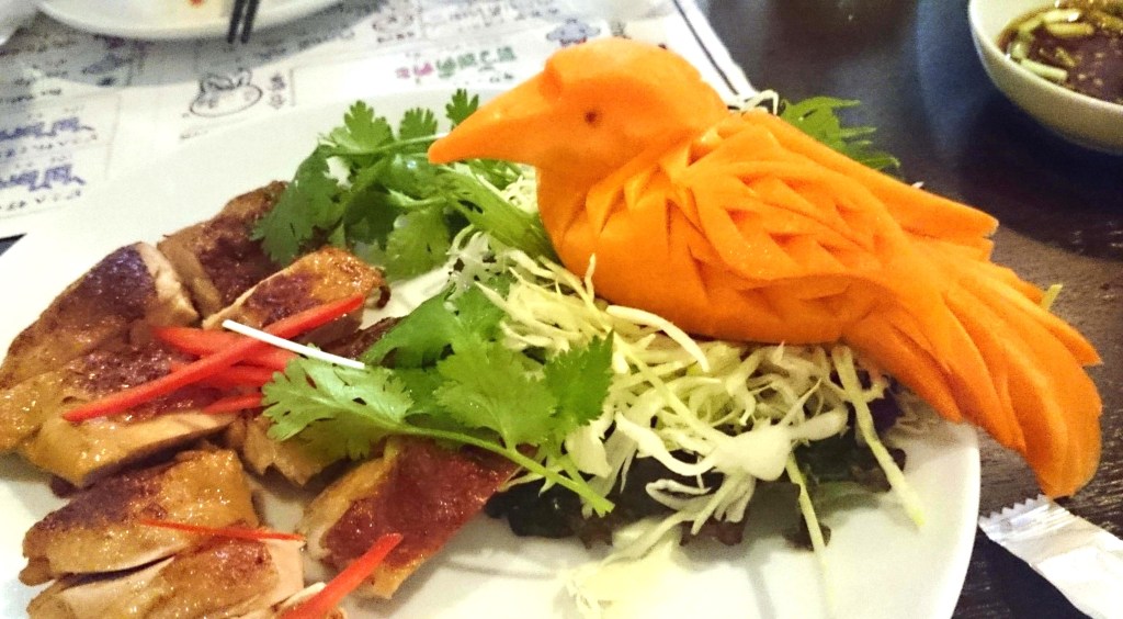 大きなニンジンで「鳥」を彫る 彫ったコックさんの顔が目に浮かぶ