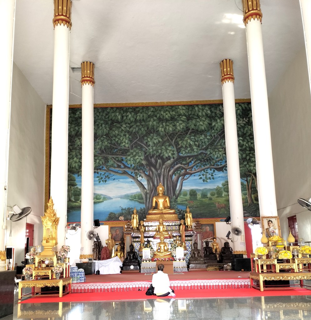 本堂の正面壁に菩提樹の絵が描かれ、その前にご本尊が安置されている
