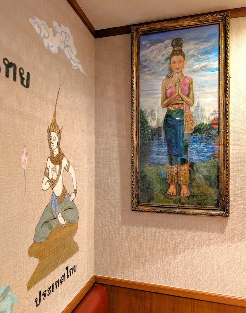 雰囲気もなかなか良い 壁には大型ディスプレイとタイ文字が躍っている「いらっしゃいませ タイ料理レストラン アロイ」