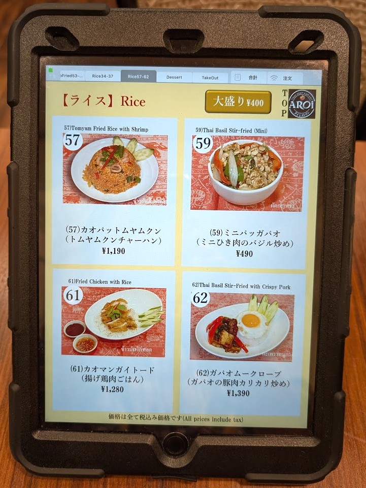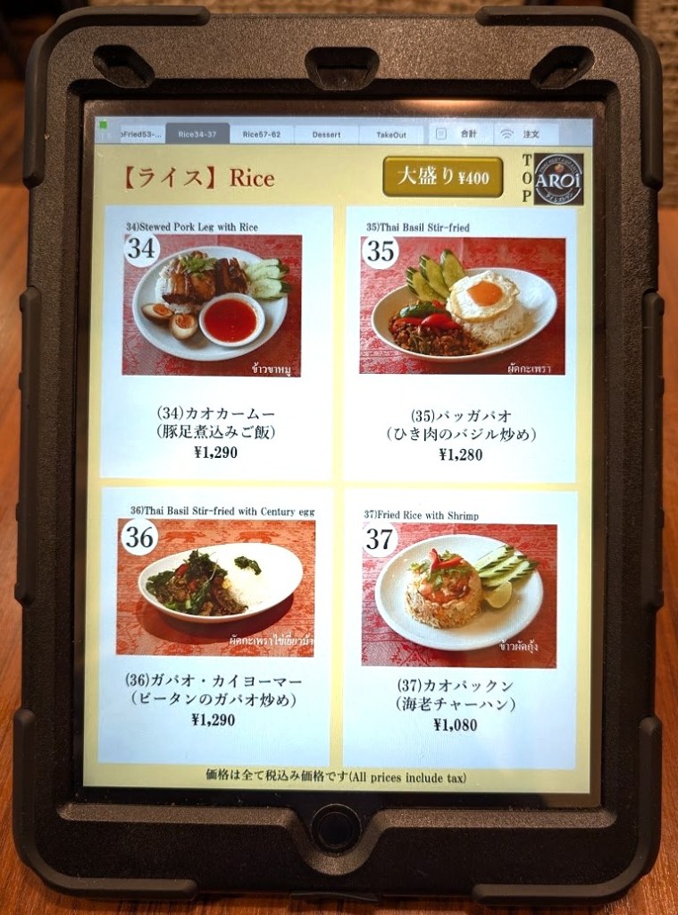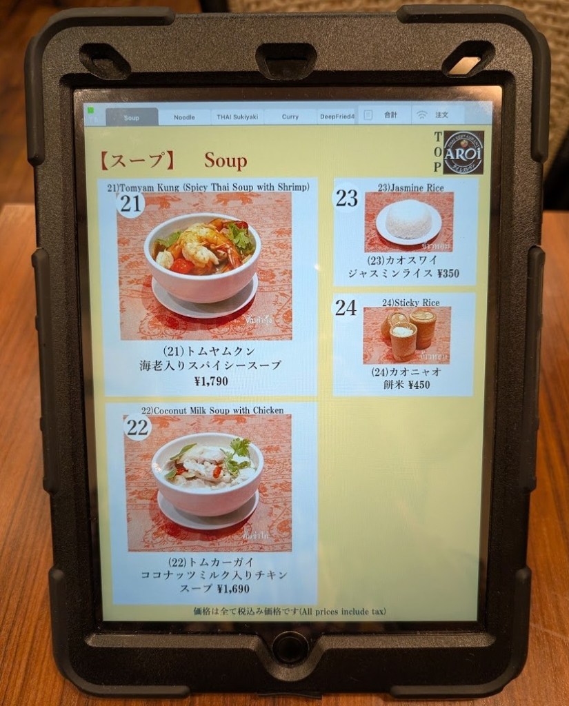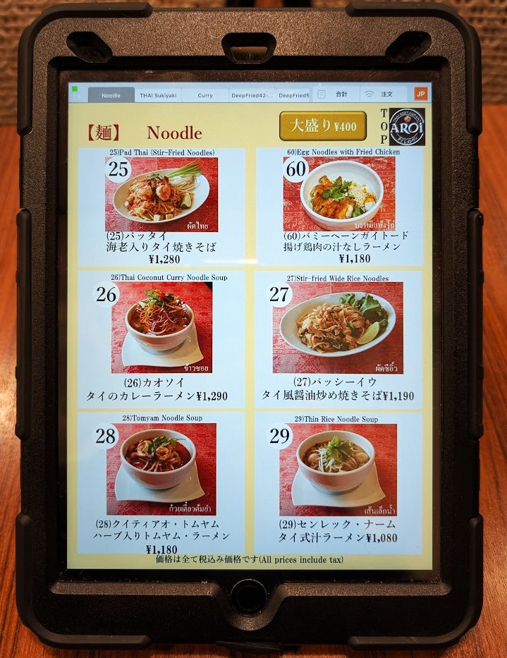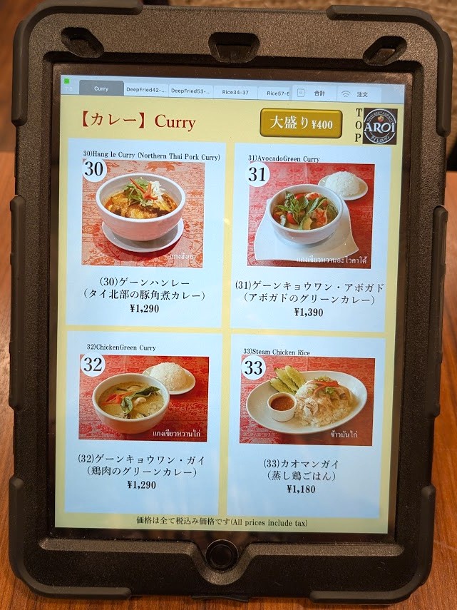 雰囲気もなかなか良い 壁には大型ディスプレイとタイ文字が躍っている「いらっしゃいませ タイ料理レストラン アロイ」