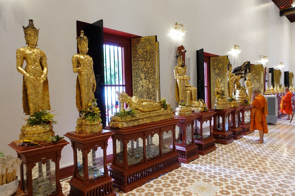 金ぴかの立像 ประธาน は圧巻、周りにはたくさんの仏像が鎮座している、その前でお参りの記念写真を撮るチェンマイ人たち、きっと仏像は時の流れを感じているはず