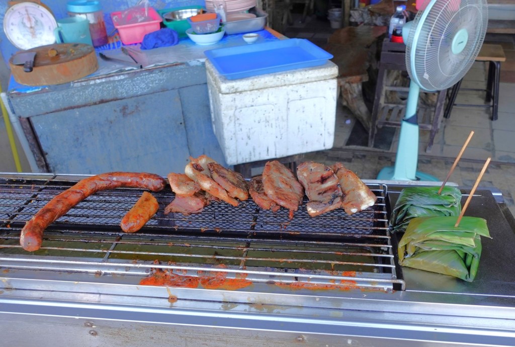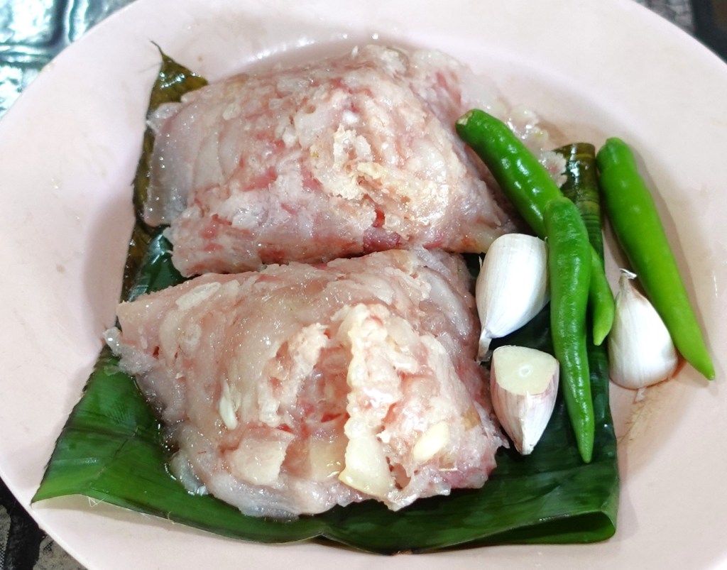 「ジンソムモック」จิ้นส้มหมก ジンソムとは北タイ弁で「豚の発酵ソーセージのネーム」のことで、これをバナナの葉に包んで蒸したもの 酸っぱくてとても美味しい 生の唐辛子とニンニクが添えられていた
