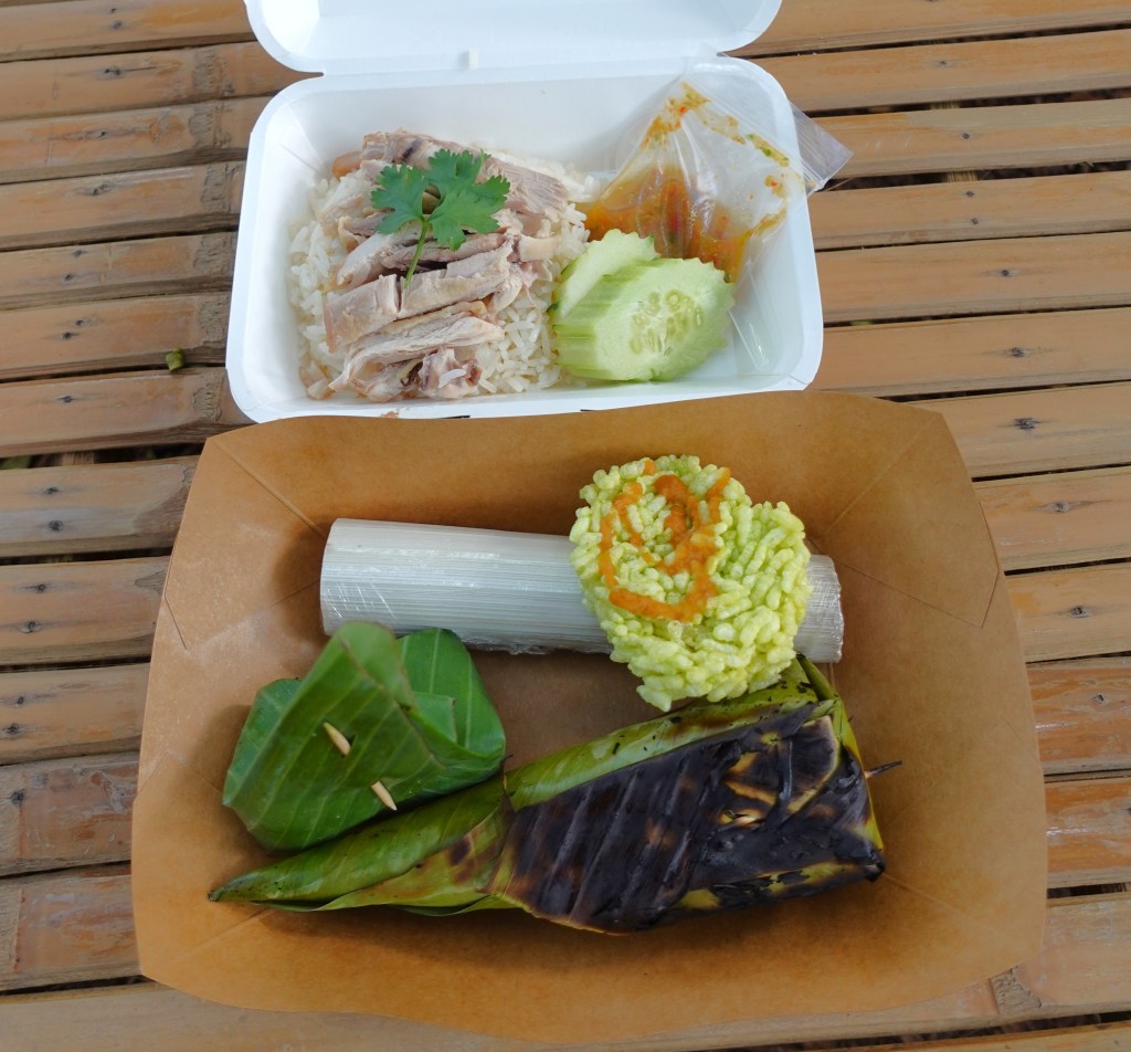 パック詰めの料理も山積み状態、その中でカオマンガイを選んだ。ローカル色豊かなもち米系も