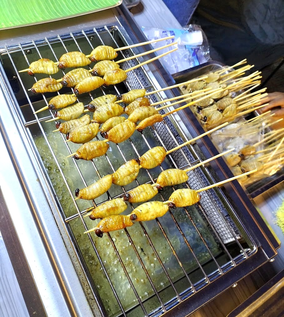 カイコのさなぎの串焼き 1本の竹串に30匹、日本では多すぎかも。タイ東北部チェンカーンのウォーキングストリート