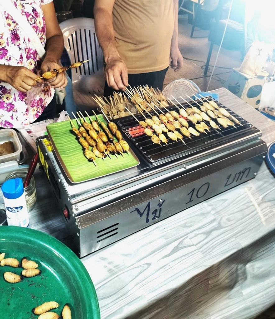 ヤシオオオサゾウムシの串焼き1本10バーツ 塩をふっていただく、カリッとする頭部がアクセント、旨い