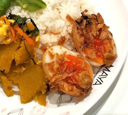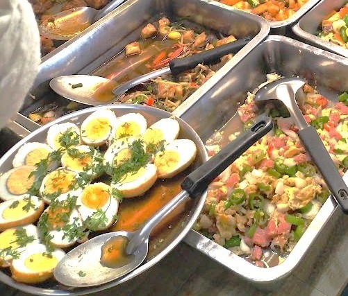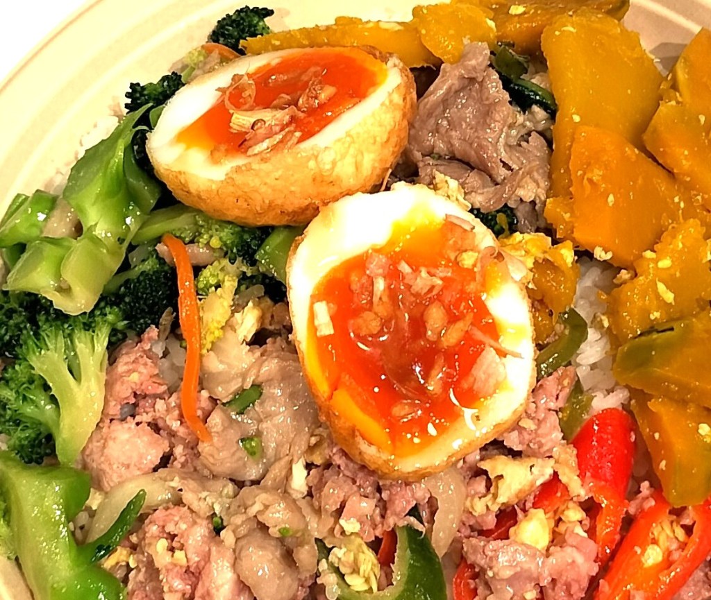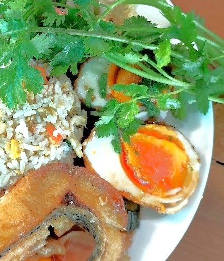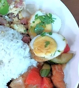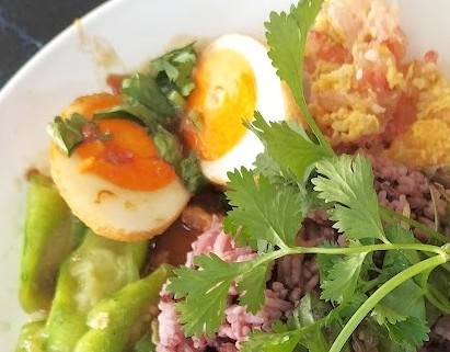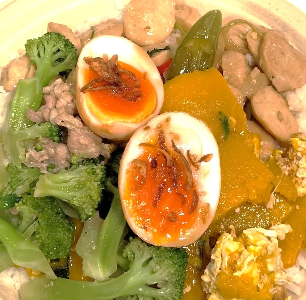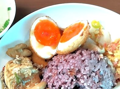 自分流ぶっかけ飯の食べ方は、たくさんある料理の中から3品ほど指さしてご飯の周りに盛ってもらい、4品目は「カイダーオ」目玉焼きか「カイルーククーイ」揚げ茹で卵のタマリンドソースがけをのせてもらっている。