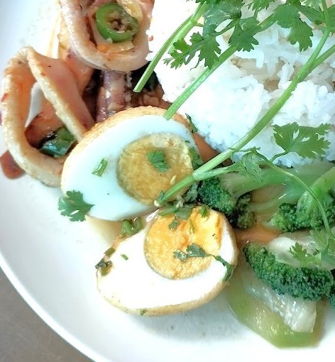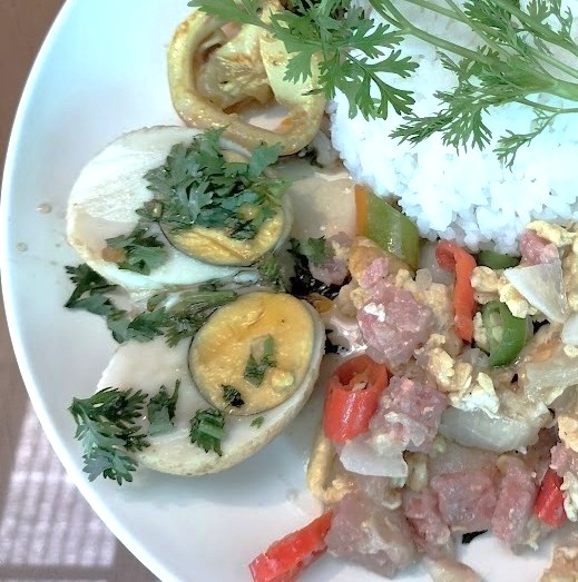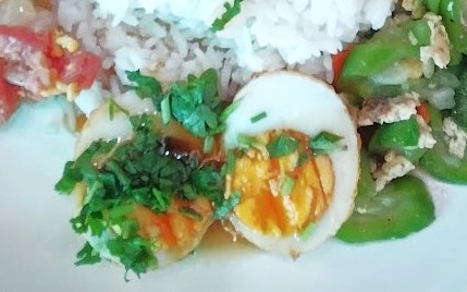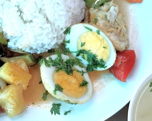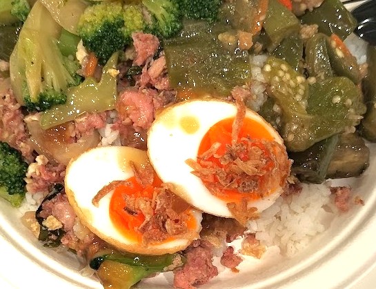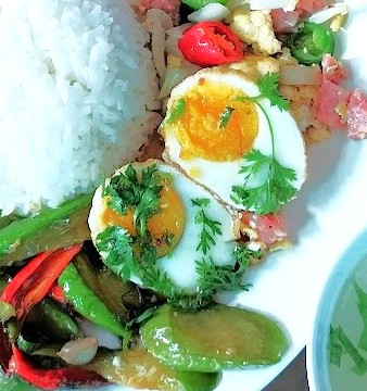 この卵料理名を教えてくれたのはぶっかけ飯屋の少女達である。ど忘れして「カイ」卵と注文すると彼女達は笑って「カイルーククーイ」ねと返ってくる。