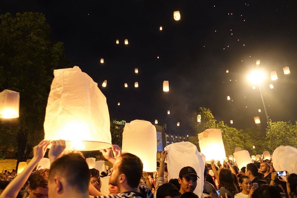チェンマイ・ターペー門でカウントダウンのコムローイ上げ